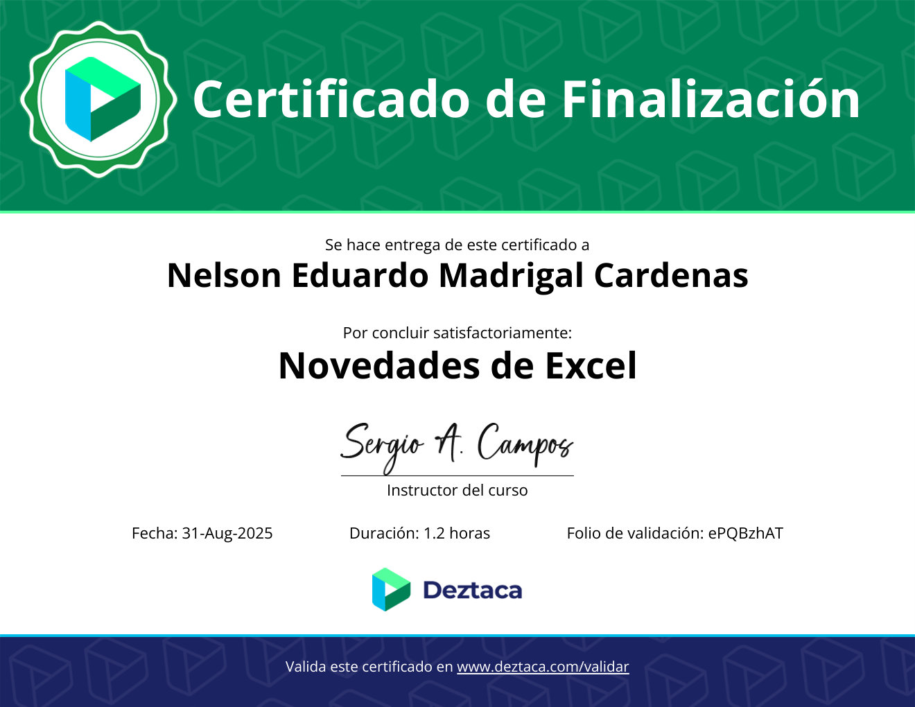 Mi nombre es Nelson E. Madrigal Cardenas, nacionalidad Colombiana. Actualmente tengo 59 años de edad. He visto los cursos de Sergio de en el tema de VB para excel pero no he logrado afianzar este conocimiento. Mil gracias