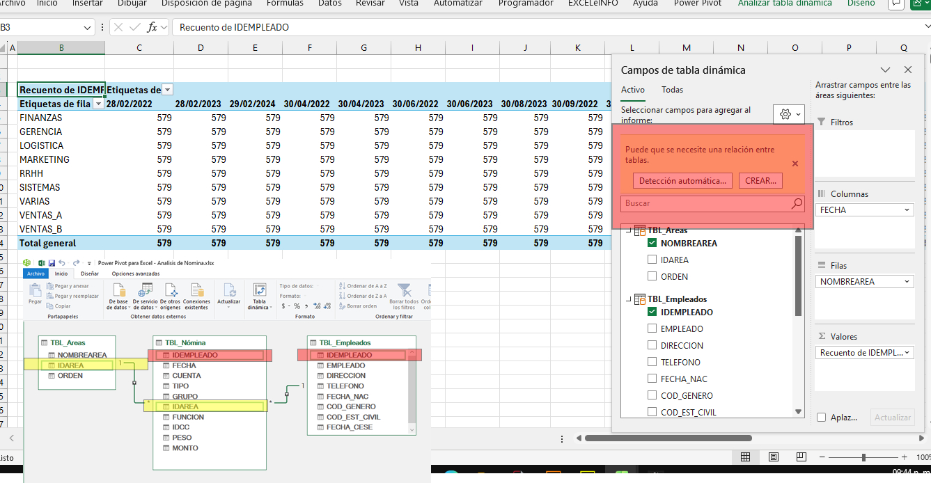 Ahora en el caso Nomina, todo bien, las tablas dinamicas funcionan muy bien, se guarda el archivo. al dia siguiente, retomo el archivo, lo abro, al parecer todo bien, hasta que, cuando comienzo el video CASO PRESUPUESTO, en la hoja POR EMPLEADO, elaborando la tabla dinamica, no me funciono, primero mensaje que no habia conexion con la base de datos, ok, actualice la conexion con la base de datos, archivo excel y archivo texto, conectados (conexion exitosa), revise las relaciones de las tablas, nombres encabezados, todo bien, al hacer la tabla dinamica me muestra datos como si no tubiera relaciones de tablas, (valores repetidos en todo), segun la tabla dinamica me comenta en un recuadro amarillo que es posible que falten relaciones en las tablas, y en Power Pivot, las relaciones estan correctas. Me hace pensar que el problema es mi Excel, esta corrupto o mal configurado.