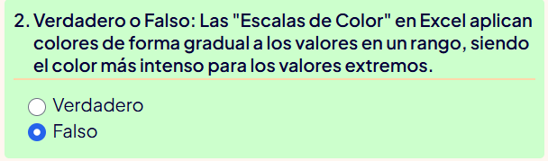Gracias por avisarnos. Ya corregimos la respuesta en el quiz para que refleje correctamente cómo funcionan las Escalas de Color en Excel.