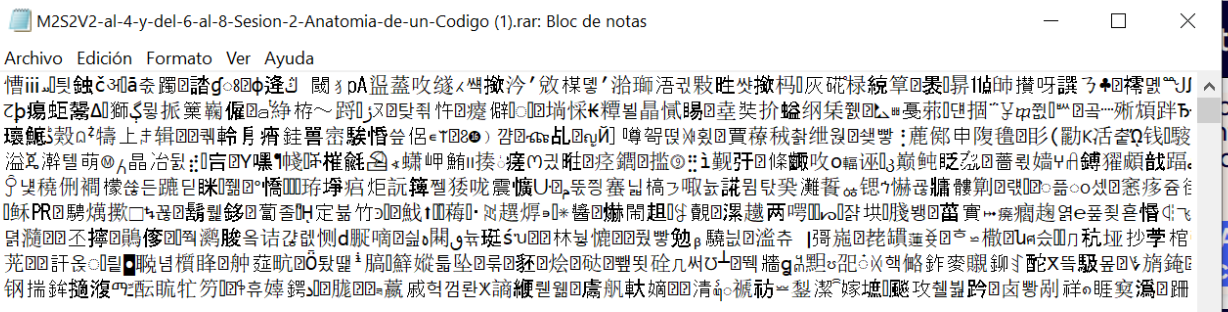 Por lo que vemos, el archivo que estás intentando abrir es un .rar, que es un tipo de archivo comprimido. Al abrirlo directamente con el Bloc de notas, el contenido aparece como caracteres sin sentido porque aún no ha sido desempaquetado.