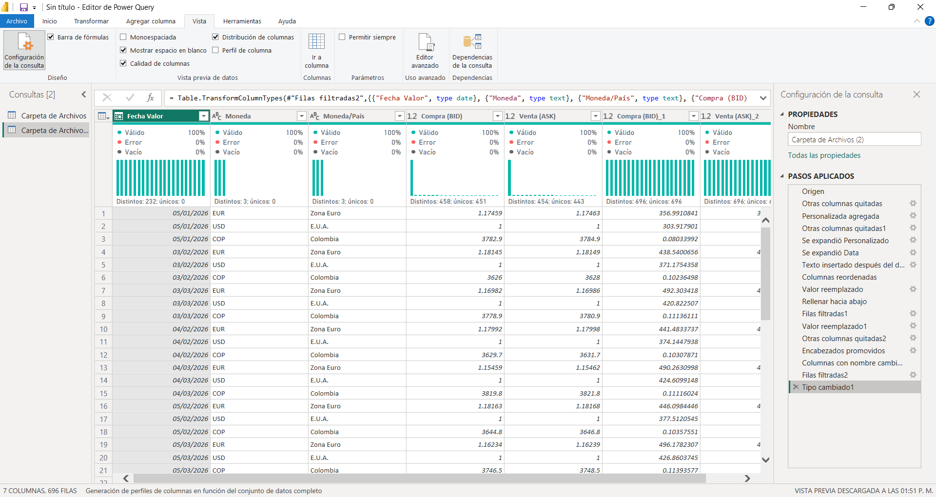 Una vez expandida la información: 7.- Duplique la columna donde se encontraba la fecha valor 8.- De esa columna extraje > despues del delimitador (use: "Fecha valor: ") 9.- Aqui pude aplicar limpiar esa columna pero sustitui las celdas en blanco por "null" (ya que no rellenaba hacia abajo) 10.- Rellene hacia bajo la fecha 11.- Y depues filtrar, primero las columnas para quitar las columnas extras, por espacios en blanco, despues por las monedas deseadas 12.- Donde esta la abreviación de la moneda sustitui "null" por la palabra moneda 13.- Use la primera fila como encabezado 14.- Filtre nuevamente para quitar el encabezado repetido 15.- Por ultimo detectar el Tipo de Dato