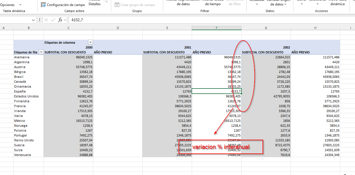 Estimados: me gustaría agregar un campo calculado en la TD a la derecha de cada campo "año anterior", para calcular la variación porcentual, pero al ser un modelo de datos no me lo permite (sólo lo pude hacer si la TD la genero a partir de una tabla aislada). ¿existe alguna forma de agregar un campo calculado? Gracias Gustavo