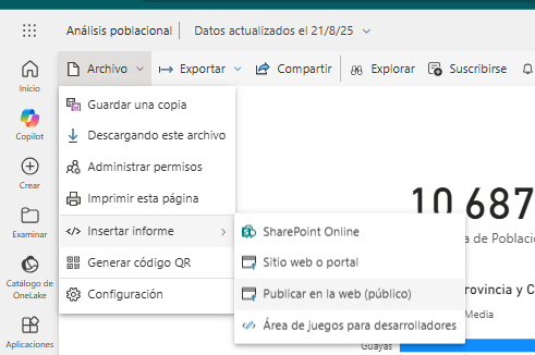 Revisé tu pantalla y la opción de “Publicar en la web (público)” no aparece porque no está habilitada. Eso suele depender de restricciones del administrador del servicio Power BI.